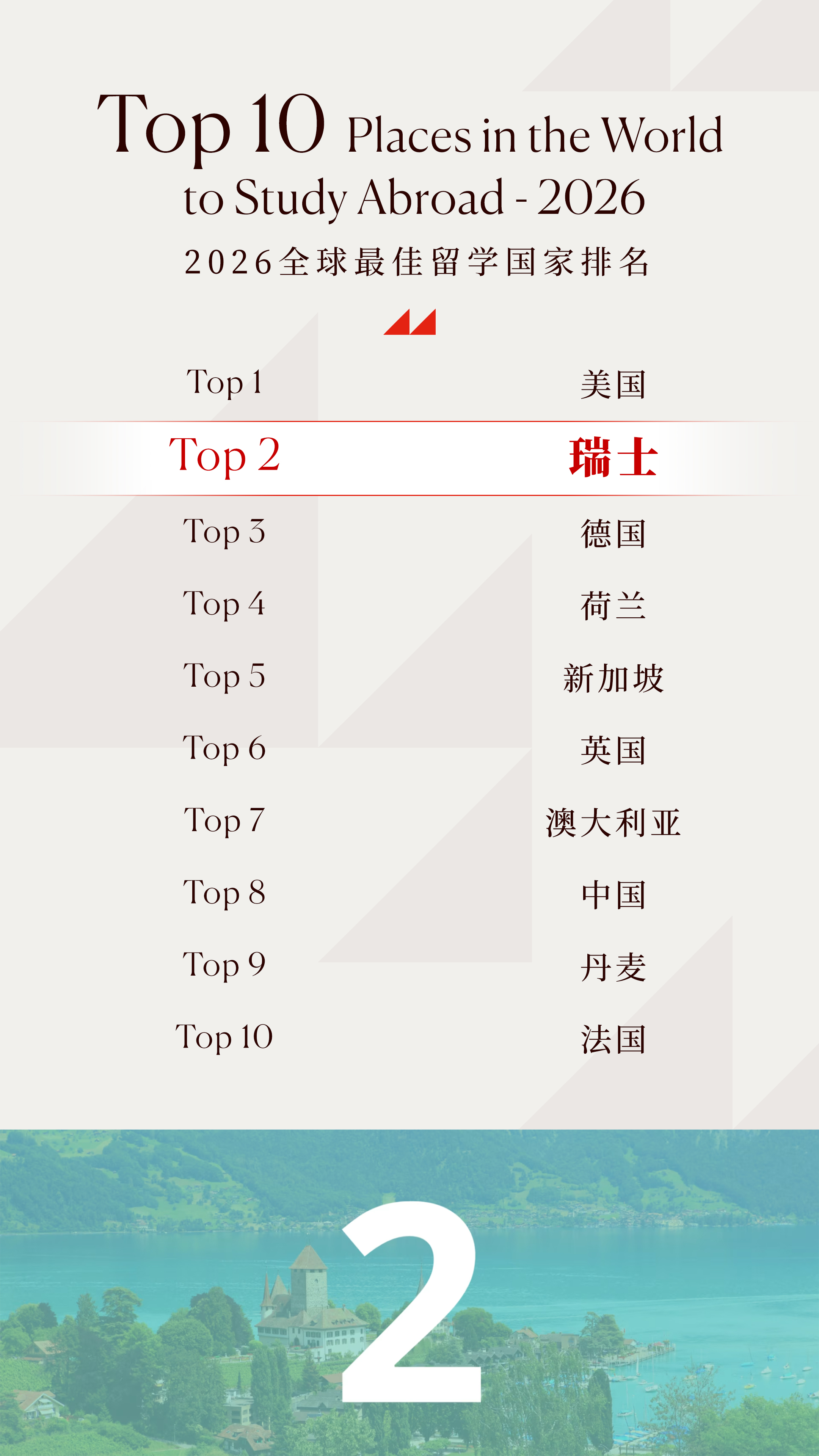 近日,国际知名教育网站educations.com正式发布2026全球最佳留学国家排名,瑞士从去年第3位强势跃升至全球第2,再次印证了瑞士教育世界领先的综合实力,及其对全球学子的独特吸引力。